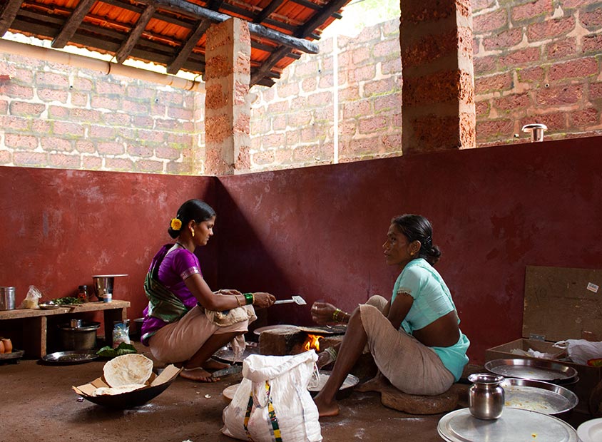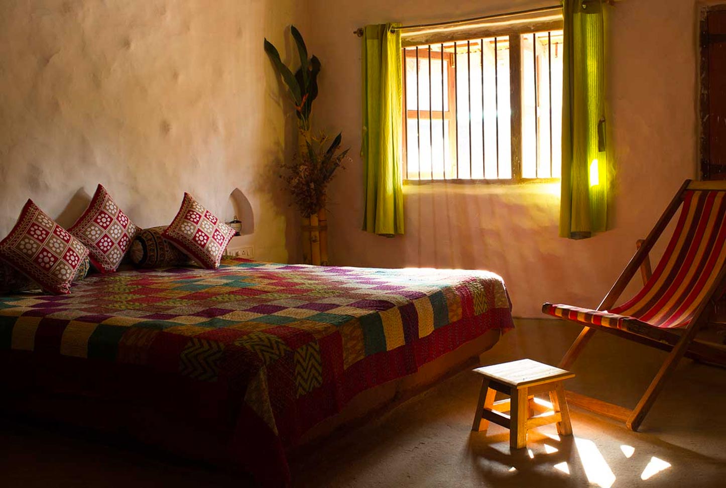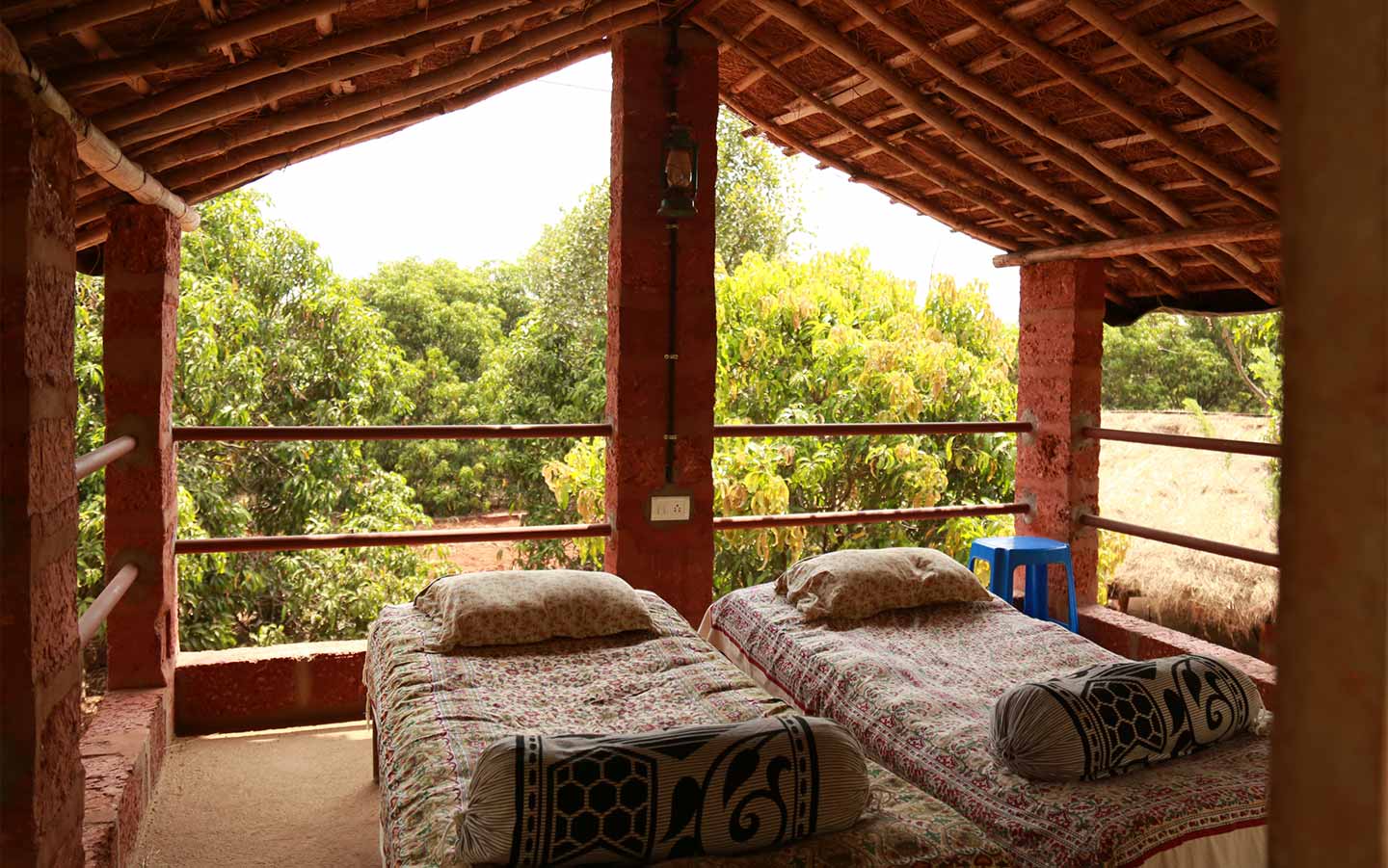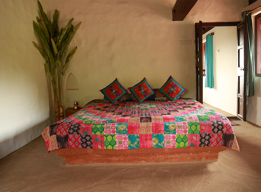 The traditional and local, Konkan styled house built with red laterite stone is a cozy abode hidden in the lush greens orchard and the organic farm. The house is the home of the farmer couple where they personally host travelers offering them an opportunity to live with a farmer and experience farming, making it a perfect homestay. The house décor is rustic, simple and earthy with the dung smeared floors and wooden furniture made by the local artisans.