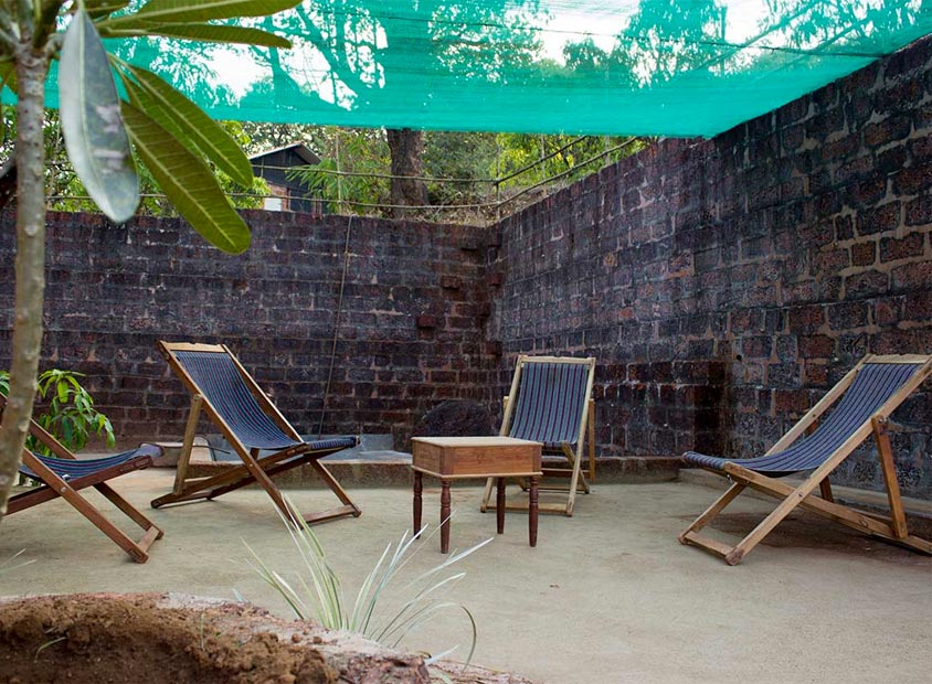 The tiny ‘take a dip’ pool filled with the ground water from the farm wells is a charm in the summers for sure. The backyard is also laden with flowering plants blossoming throughout the year. It also has the lush bunches of Lemon Grass and the Tulsi that gives aroma to your cup of tea, every morning. The backyard stretches furter up in the hills with the mango and cashew trees and the local fauna.